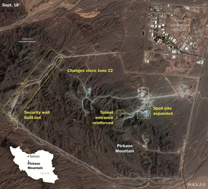 Три эксперта по ядерной программе Ирана, проанализировавшие спутниковые снимки, отметили три ключевых признака активизации строительства: возведение 1200-метровой защитной стены и прокладка новой дороги вдоль неё с конца июня, укрепление конструкции входа в туннель и увеличение объёмов вынутой породы.